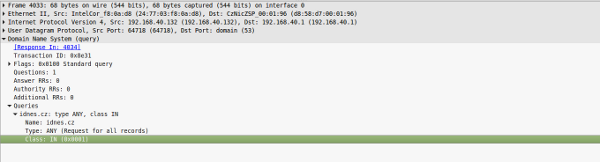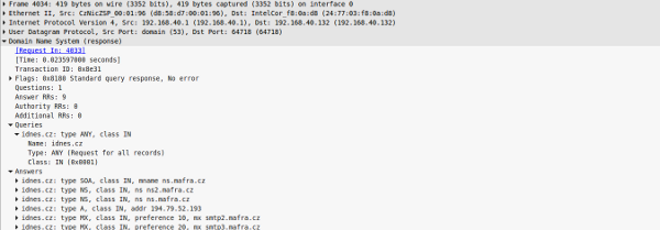 Porovnání zachyceného DNS dotazu typu ANY a odpovědi na daný dotaz. Všimněte si, že dotaz má velikost 68 bytů, zatímco odpověď 419 bytů.