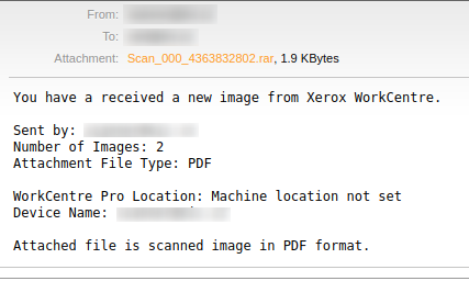Aktuálně zaznamenáváme zvýšený výskyt e-mailů přesvědčivě se tvářících jako oskenovaný soubor poslaný tiskárnou. V příloze je přiložený archív s příponou .rar. V archívu je zabalený .vbs skript, který již poté dokáže napáchat škodu.